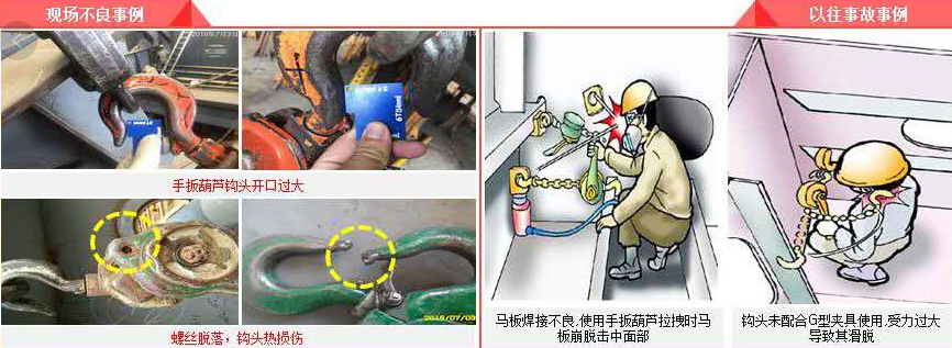 2、工人沒(méi)有配合G型夾具使用導(dǎo)致葫蘆受力過(guò)大、馬板焊接不良時(shí)依然蠻拉硬拽使馬板崩脫擊中面部等不良現(xiàn)象在作業(yè)現(xiàn)場(chǎng)時(shí)有發(fā)生。