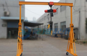 因為吊架僅是一個門形架子,兩邊是承重桿和車輪,上方是可供懸掛設備的軌道,所以單靠龍門吊架并不能完成設備吊裝工作,需要在上面的工字梁上安裝好滑線夾的鋼絲,再安裝電動葫蘆或者手拉葫蘆、單軌小車、手推小車等起吊工具,
